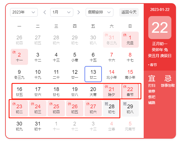 2023年1月16日-2023年1月28日,2023年1月29日(正月初八)正式上班。