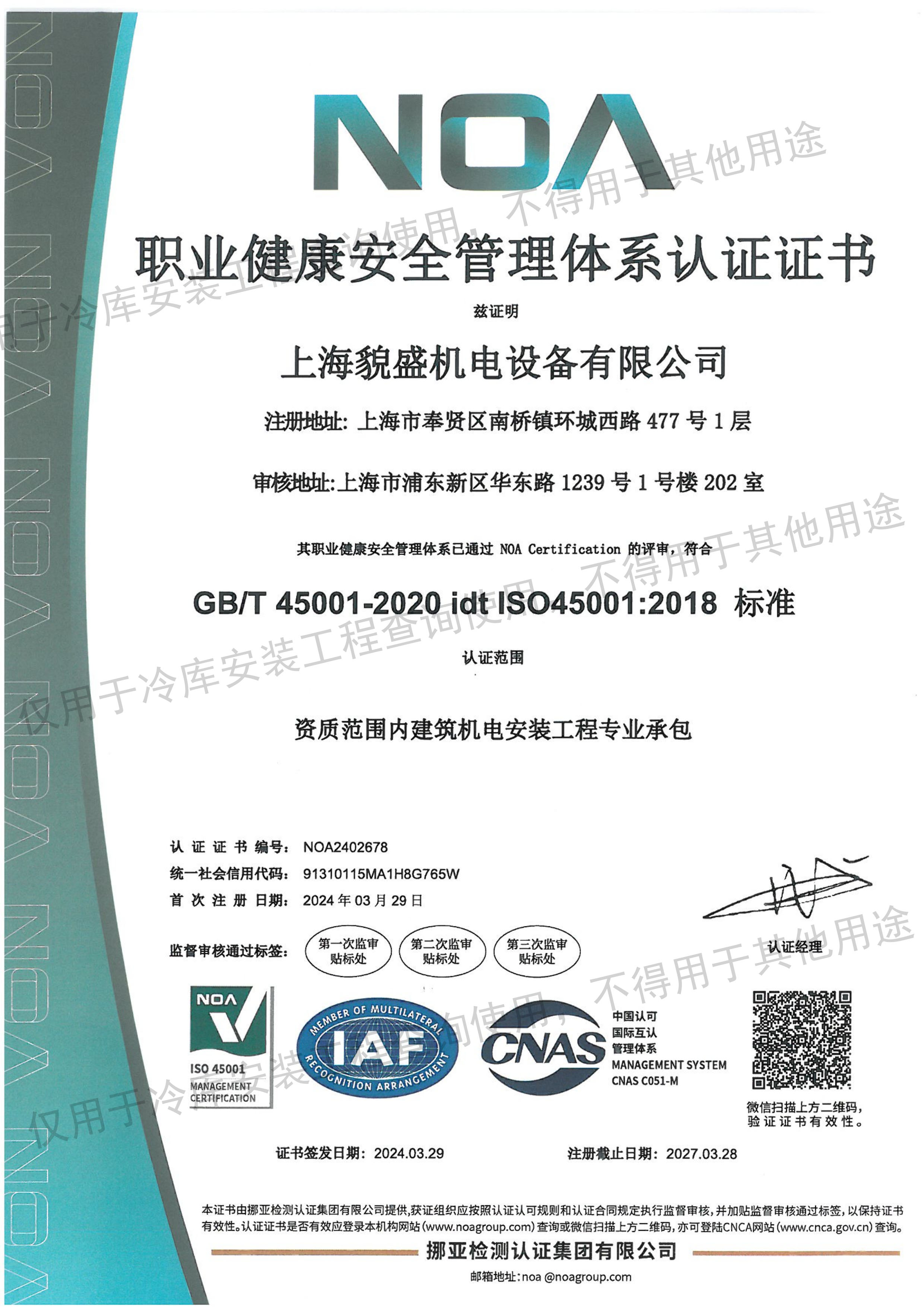 制冷设备ISO职业健康管理认证证书