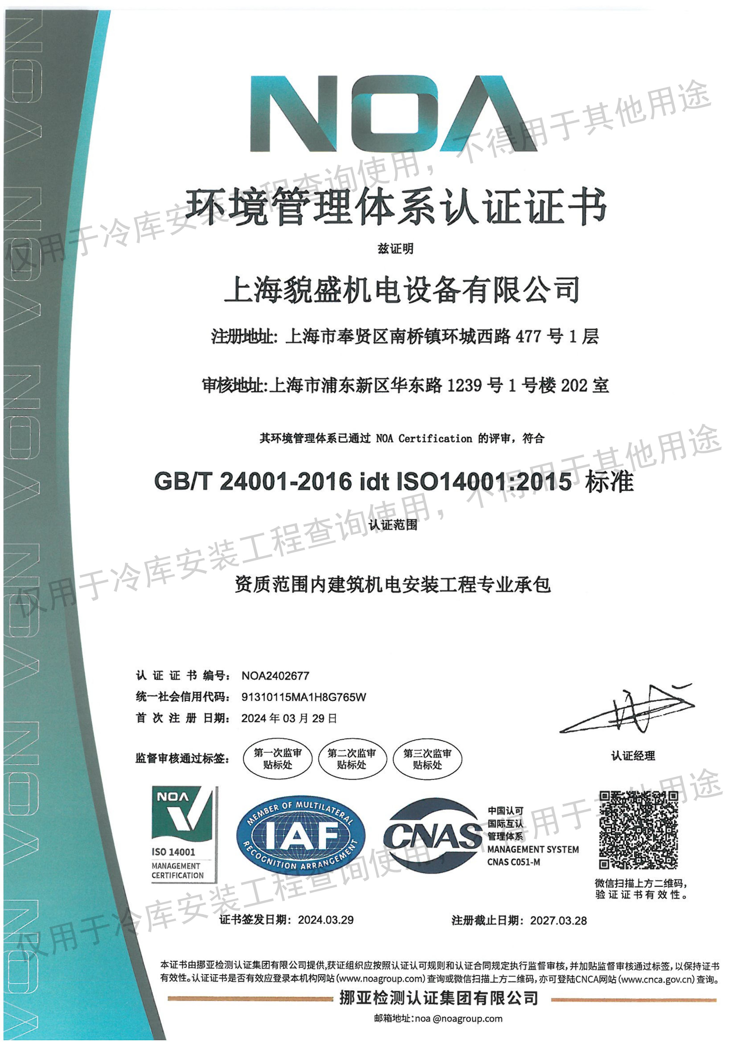 制冷设备ISO环境管理认证证书