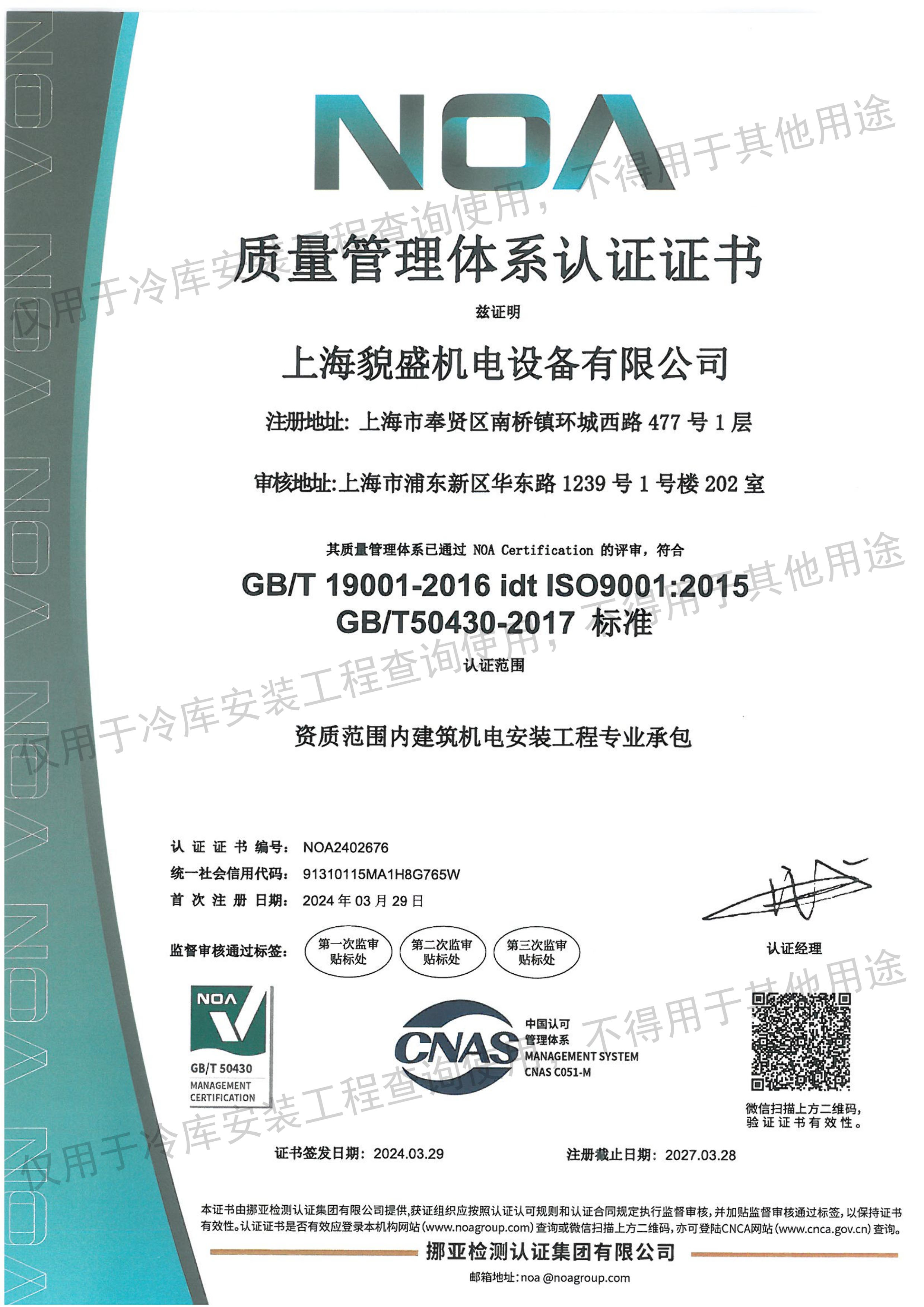 制冷设备ISO质量管理认证证书