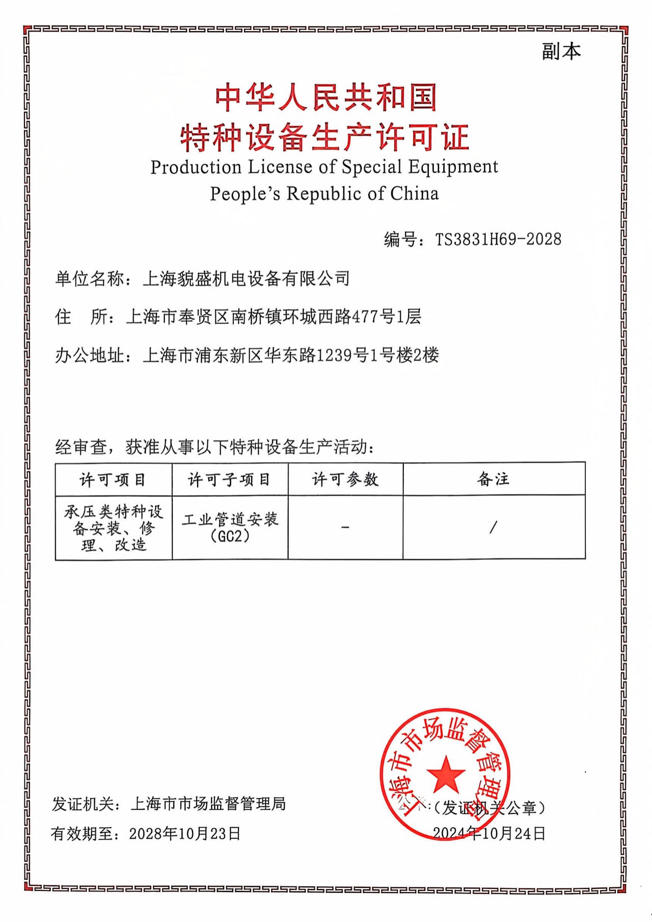 特种设备生产许可证