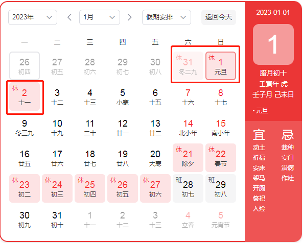 2023年1月16日-2023年1月28日,2023年1月29日(正月初八)正式上班。