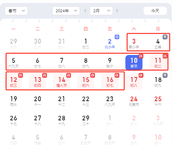 2024年2月3日-2024年2月16日,2024年2月17日(正月初八)正式上班。